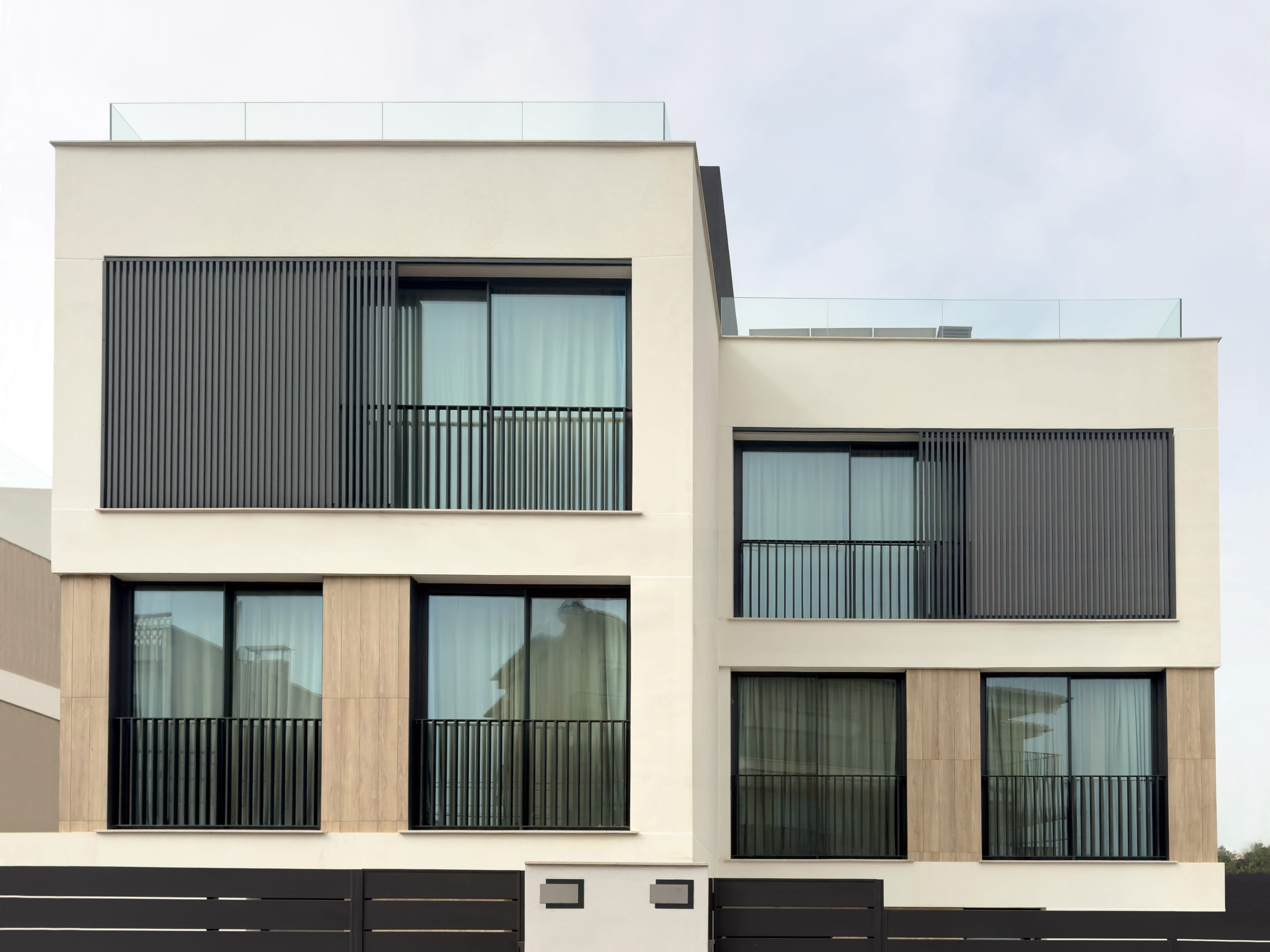 Urbanización en Porto Colom, donde hemos realizado carpinterías exteriores en aluminio CORTIZO, con persianas correderas, barandillas de Cristal tipo Q-Railling